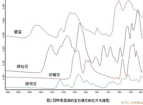 现在,很多实验室都配备了红外光谱仪,通过红外光谱仪对宝石逐一检查,可以比较快速地筛选出夹杂在碧玺饰品中的其他宝石品种。图2中,列出四种容易混淆的宝石漫反射红外光谱图。
