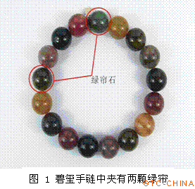 图 1 碧玺手链中夹有两颗绿帘石珠子 碧玺以缤纷的颜色赢得很多人的青睐,现在,佩带一条碧玺手链或项链已成为很多年轻人的时尚。可就在这些流行的碧玺饰品中,却夹杂着一些其他品种的宝石,比如图 1 中这条碧玺手链中,就夹杂着两粒绿帘石。 近年来,我们在