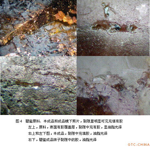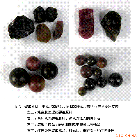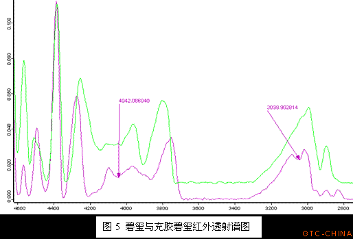 值得注意的是,我们在加工厂还发现:由于用于加工成圆珠的碧玺内部通常多裂隙,为防止碧玺在加工的过程中裂开,在加工前原料经充胶固结处理;加工过程中,切条断粒前有时也会用胶,一部分胶渗透到了碧玺的裂隙或孔洞中,这就是我们在检测时发现部分碧玺内部存在有机物充填现象的原因。国标GB/T16552《珠宝玉石 名称》中将碧玺的充填划为处理范畴,因而在鉴定过程中,一定要小心这些碧玺。图3中,碧玺原料经注胶处理,表面和裂隙中明显有残留的胶;当加工成成品后,多数碧玺表面看不出经注胶处理,只有裂隙发育的样品,在放大检查的情况下,可以见到裂隙中残留的胶(见图4中右下图)。目前,红外光谱仪在翡翠B货的检测中应用十分成功,在充填相同或相似有机物的其它品种宝玉石中也具有鉴定意义。图5中,绿色红外谱图为天然碧玺透射谱,粉红色为经充胶处理碧玺原料的透射谱图,经充胶处理的碧玺4042cm-1、3038cm-1处吸收明显,与翡翠B货中胶的吸收有很好的可比性,这一点值得做进一步研究。另外,荧光特征也具有一定的指示意义。