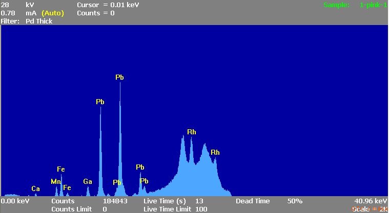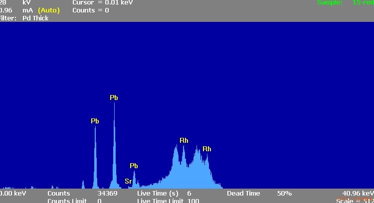 用QUANT’X 型荧光能谱仪对样品的金属元素进行测试,发现绝大多是样品里面都有较多的Pb峰的存在,如下图3 图4: