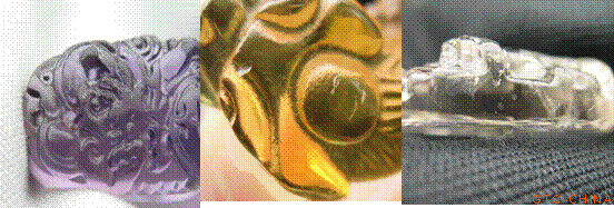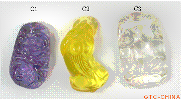 经过样品的常规鉴定样品C1、C2、C3分别为合成紫晶、合成黄晶和水晶,且均有覆无色膜现象。
