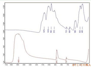 采用布鲁克TENSOR27型红外光谱仪对样品进行了测试,漫反射法,分辨率为2cm-1,测量范围为400~1600cm-1,扫描信号累加为32次。