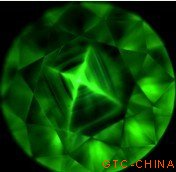 合成钻石:HPHT合成钻石大多为Ⅰb型;CVD合成钻石都是Ⅱ型的。大家都知道,使用DTC公司的DiamondSure可以快速地筛选天然钻石,不能通过测试的钻石需要使用DiamondView来测试。DiamondView利用钻石在短波紫外光下所产生荧光的不同生长区域模式图,可以有效地区分天然钻石与合成钻石。DTC发明的另一类仪器—DiamondPlus,主要用于区分改色钻石。但就从科技发展本身的规律来看,所有的仪器并不可能成为终极武器。文献资料显示,还有更多的大型仪器和研究方法用于检测合成钻石及优化处理方法,例如,液氮冷却技术用于可见光吸收检测、红外光谱检测、光致发光光谱、激光拉曼光谱、阴极发光等等。