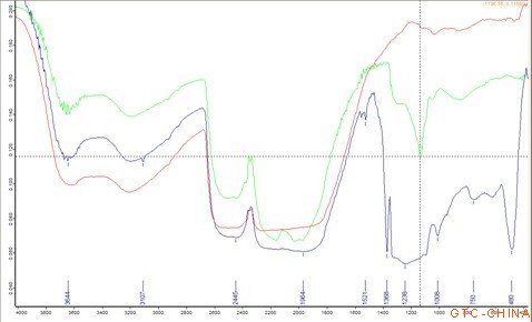 图3: 实测红外光谱图(红色为Ⅱ型;绿色为Ⅰb型合成钻石;蓝色为Ⅰa型天然钻石)