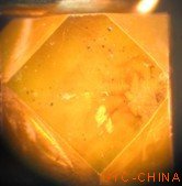 图6:HPHT合成黄色钻石表面特征(可见特征的厥叶状生长纹和金属包体)