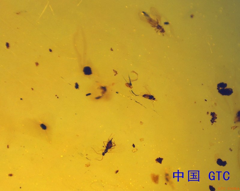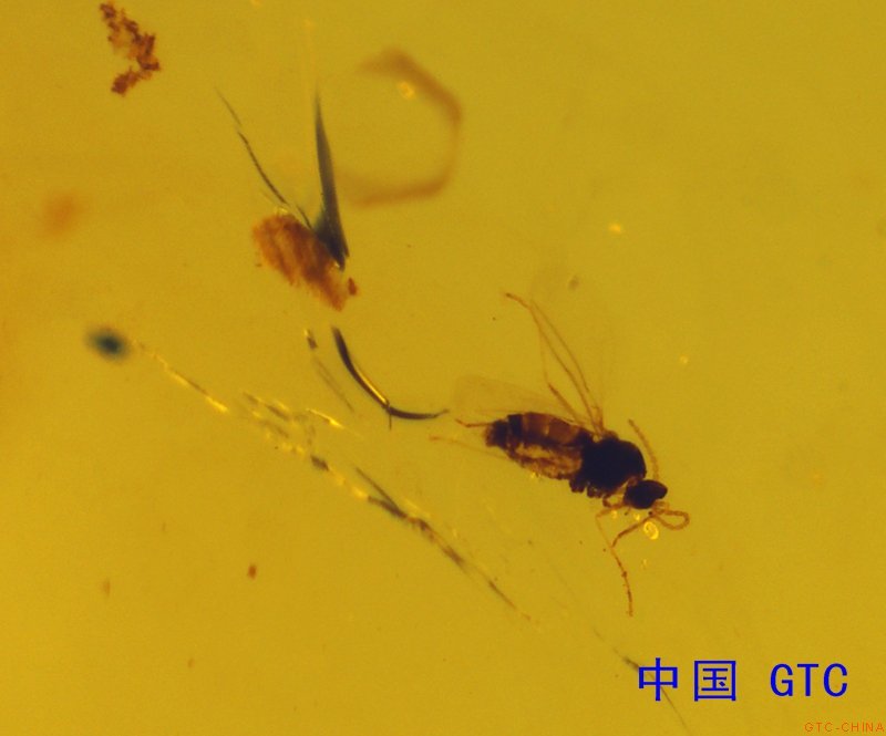 琥珀中的昆虫和碎屑包体,昆虫形体完整,形态自然,挣扎状 放大,这只昆虫仿佛还在飞翔 似植物种子,在应力作用下周围产生了裂隙 正交偏光镜下,琥珀中的包体周围产生一种十字形的异常消光,而且消光位相同,当转动琥珀,这种十字消光现象随之消失