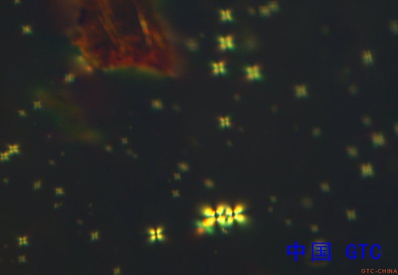 正交偏光镜下,琥珀中的包体周围产生一种“十”字形的异常消光,而且消光位相同,当转动琥珀,这种“十”字消光现象随之消失