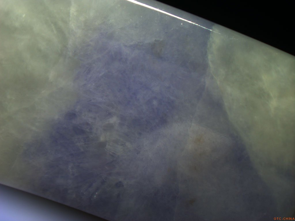 蓝紫色区域,矿物颗粒粗大,具纤维状结构;蓝紫色与浅绿色分界清晰