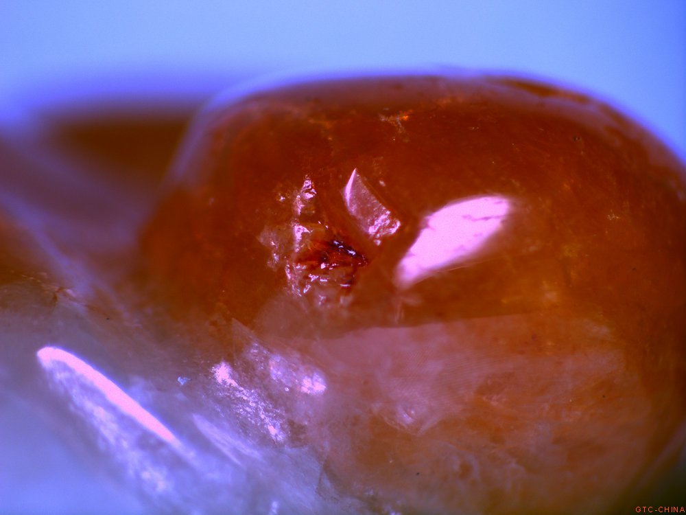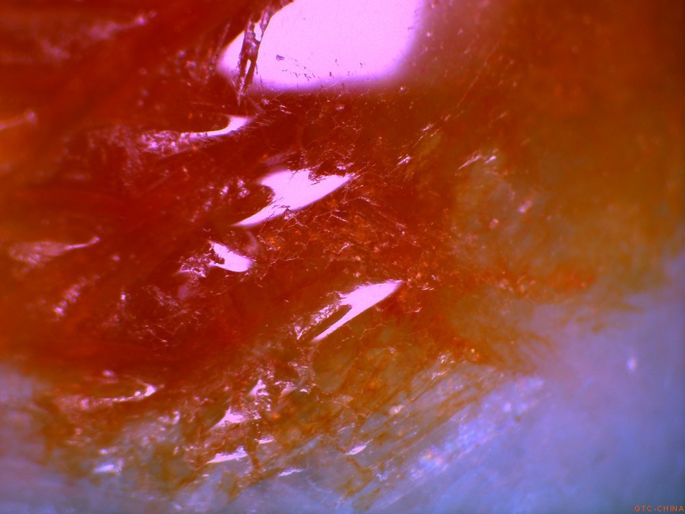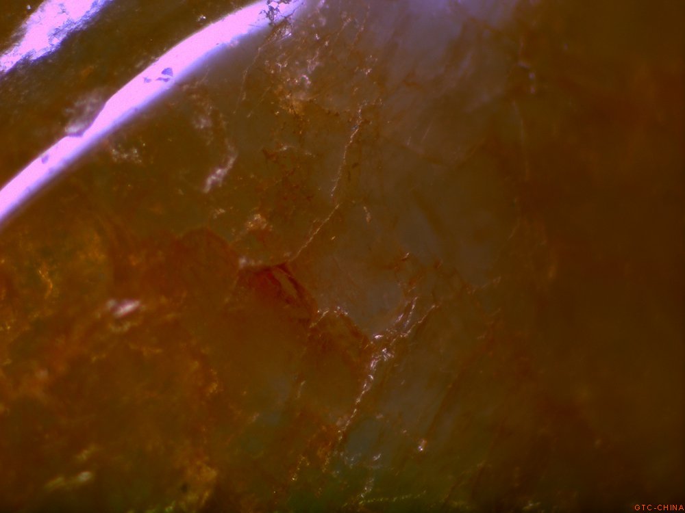 30倍镜下观察,颜色限于浅表层,沿裂隙分布。 40倍镜下,裂隙里颜色浓集。 局部凹坑里,可见褐红色的染料浓集。30倍镜下拍摄。