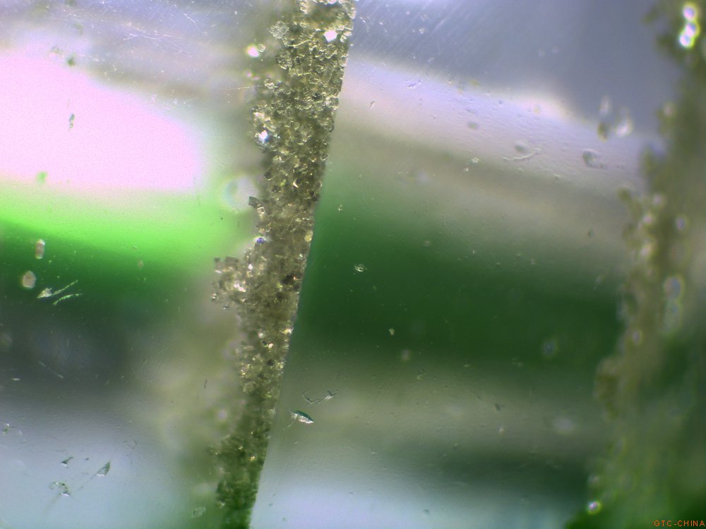 40倍镜下观察,这些绿色的包体沿水晶的某个结晶方向聚集,被磨到表面上,我们可以观察到不同的截面形状。