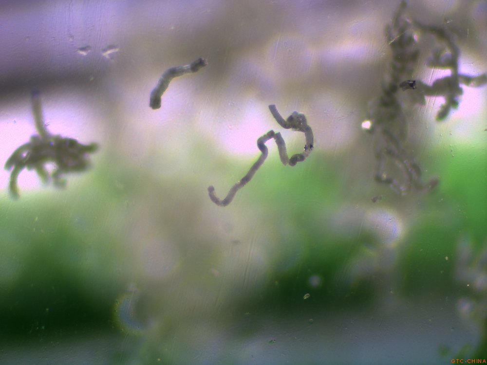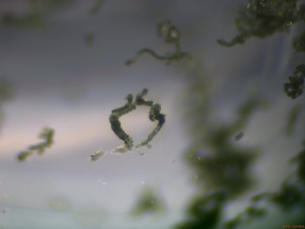 弯曲的蠕虫状包体,50倍镜下拍摄。