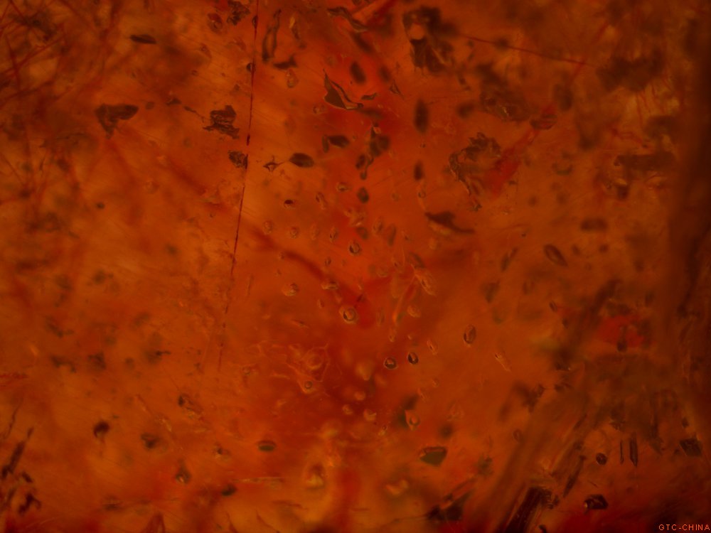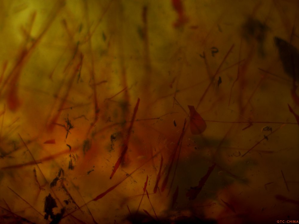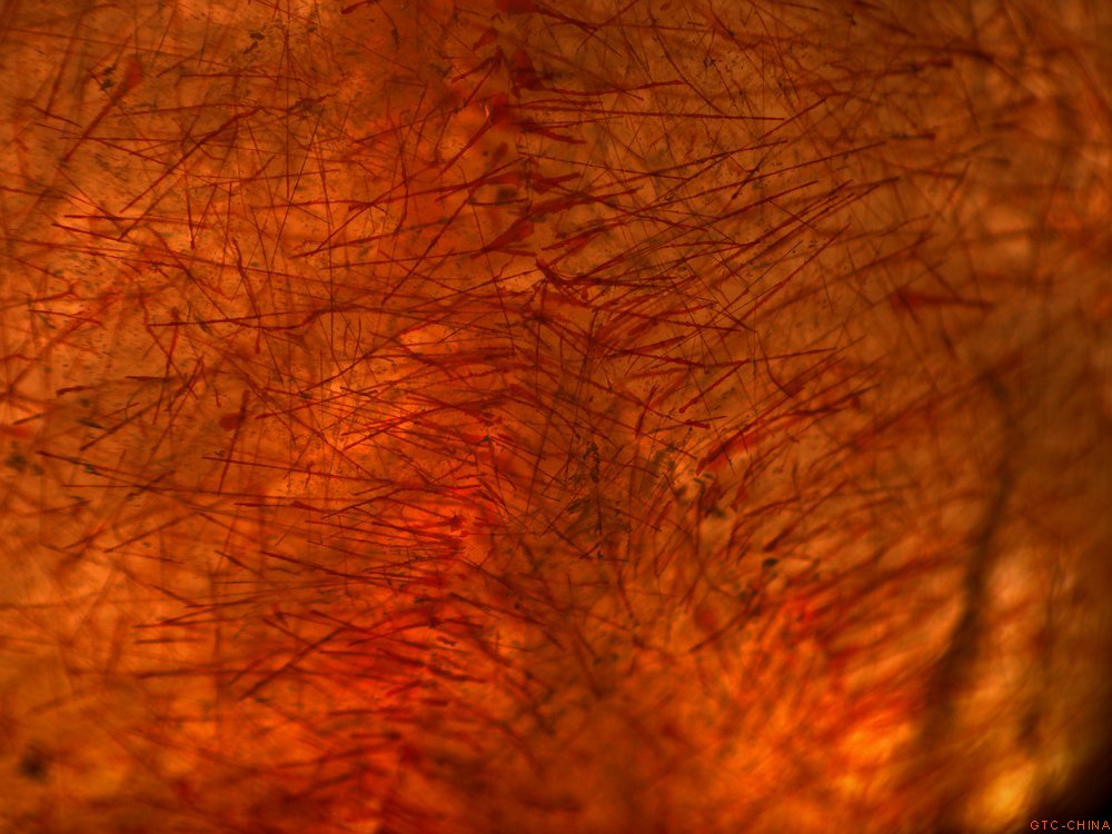 这是一件红发晶样品。 发按某种结晶方向展布,形成一个倒丫字形。摄于10倍镜下。 30倍镜下,可见晶体包体、两相包体。 50倍镜下,发呈褐红色,半透明,长片状。