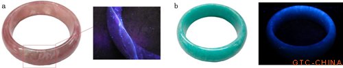 Fig.4 UV fluorescence characteristics of polymer-filled gemstones