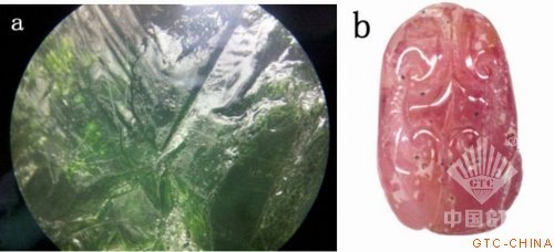 本文样品来自于广州荔湾广场,包括半宝石和玉石。常见高分子聚合物充填工艺分为两种:一种是先原料充填,然后是抛光前的半成品充填,即两个步骤都充填,如花件、弧形戒面;另一种仅在原料时充填,加工成成品后不再充填,如珠子、刻面形戒面。图1a为经有机胶充填的碧玺原料,图1b为有机胶充填的雕刻好的半成品碧玺。