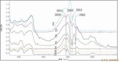 通过红外光谱测试表明:T2~T7中均存在3 056,3 034,2 965,2 924,2 862 cm-1处吸收,与各类宝石中的有机胶充填物相似,也属于环氧树脂类充填物;伸缩振动v(=C—H)导致3 056,3 034 cm-1处弱的吸收峰,随充填物体积比例的增加未出现明显变化;反对称伸缩振动vas(—CH3—)、反对称伸缩振动vas(—CH2—)及对称伸缩振动vs(—CH3—)分别导致的2 965,2 924,2 862 cm-1处强的吸收峰,随充填物体积比例的增加峰形变尖锐,当比例达80%时(样品T6)吸收强度增大,变成平缓的吸收谷,达到90%时(样品T7),2 965~2 862 cm-1范围基本完全被吸收。