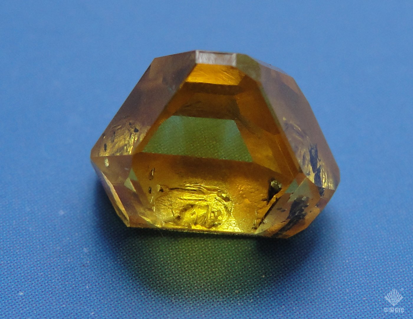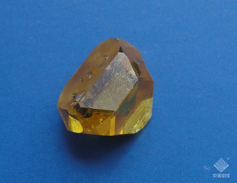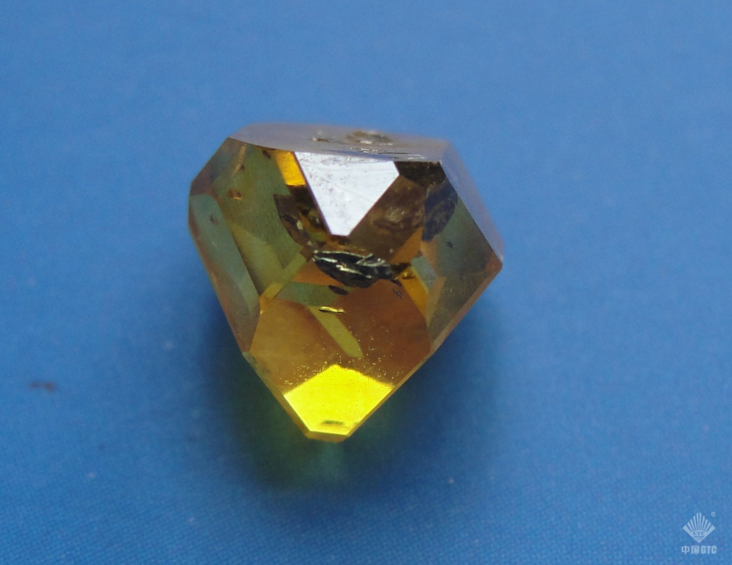 高压高温(HPHT)合成钻石多见黄色,属Ⅰ型钻石,据报道成品可达6克拉以上。 部分合成品经辐照+退火处理可改成红色、蓝色。其中,蓝色者多见,大小不等。市场售价不高。 以下是一粒近3克拉的合成钻石原石,供参考。 图1 呈黄色,透明。聚形晶,晶形完整 图2