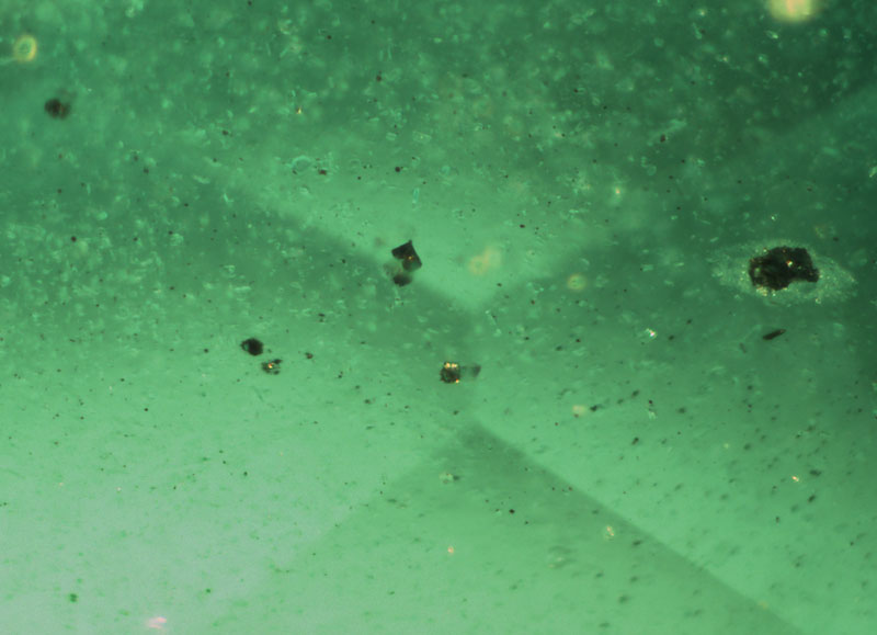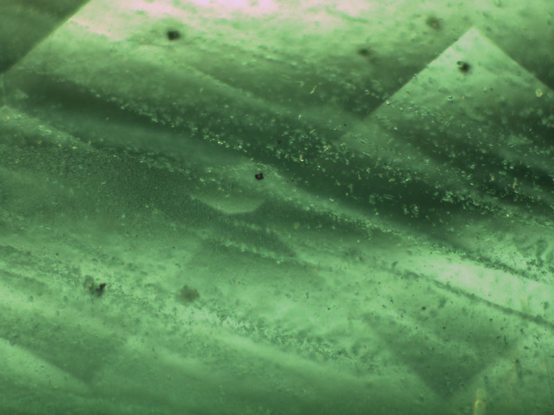 在宝石鉴定和研究工作中,利用显微对其中的包体观察是一种常规、高效的宝石学方法,以其经济、方便、无损等优点为宝石学家们最常用的方法。祖母绿因其结晶习性和形成环境的特殊性,区别绿柱石簇其他宝石品种,具有丰富的特征包体。而且这些包体因产地不同具有一定的差别,随着新产地的深入研究,这些差别被证实越来越小,从而提示我们,利用内含的包体特征鉴定产地的可靠性不断下降。下列图片从赞比亚祖母绿中拍摄。