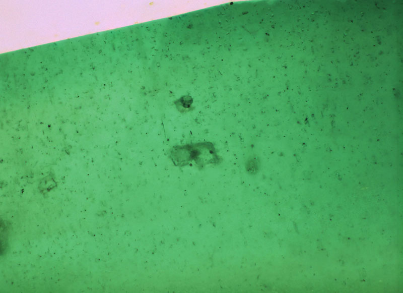 图3 均匀分布的细小黑色点状包体,中央菱面体形包体推测为方解石(50倍镜下)