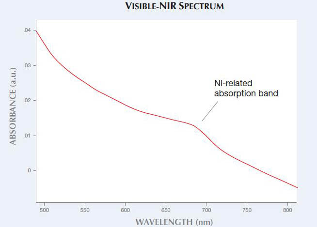 可见—近红外光谱测试显示在685nm处具有明显的与镍相关的吸收带(图2)。尽管镍是HPHT合成钻石常用的触媒,但DiamondView图像证明这颗钻石不是合成的(见图3)。虽然镍长久以前就被发现是变色龙钻石中的痕量元素(详见T. Hainschwang et al., “A gemological study of a collection of chameleon diamonds,”Spring 2005 G&G, pp. 20–34),但它在变色效应中扮演的角色还不清楚。镍同样被报道为某些钻石中的致色剂(详见:W. Wang et al.,“Natural type Ia diamond with greenyellow color due to Nirelated defects,” Fall 2007 G&G, pp. 240–243),但是这是首次被确定为变色龙钻石中主要的绿色致色原因。