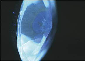 美国新墨西哥州东南部卡尔斯巴德实验室检测到一粒0.31ct带有淡绿色调的浅黄色马眼形钻石。该钻石显示强黄色荧光,并有持久的黄色磷光,以及绿色调的变色现象。当被加热或放到黑暗中一段时间,绿色调便会暂时消失,橙色调增加。图1显示这颗钻石加热前和加热后瞬间的变化。不幸的是,颜色饱和度低使得变色现象也不明显。