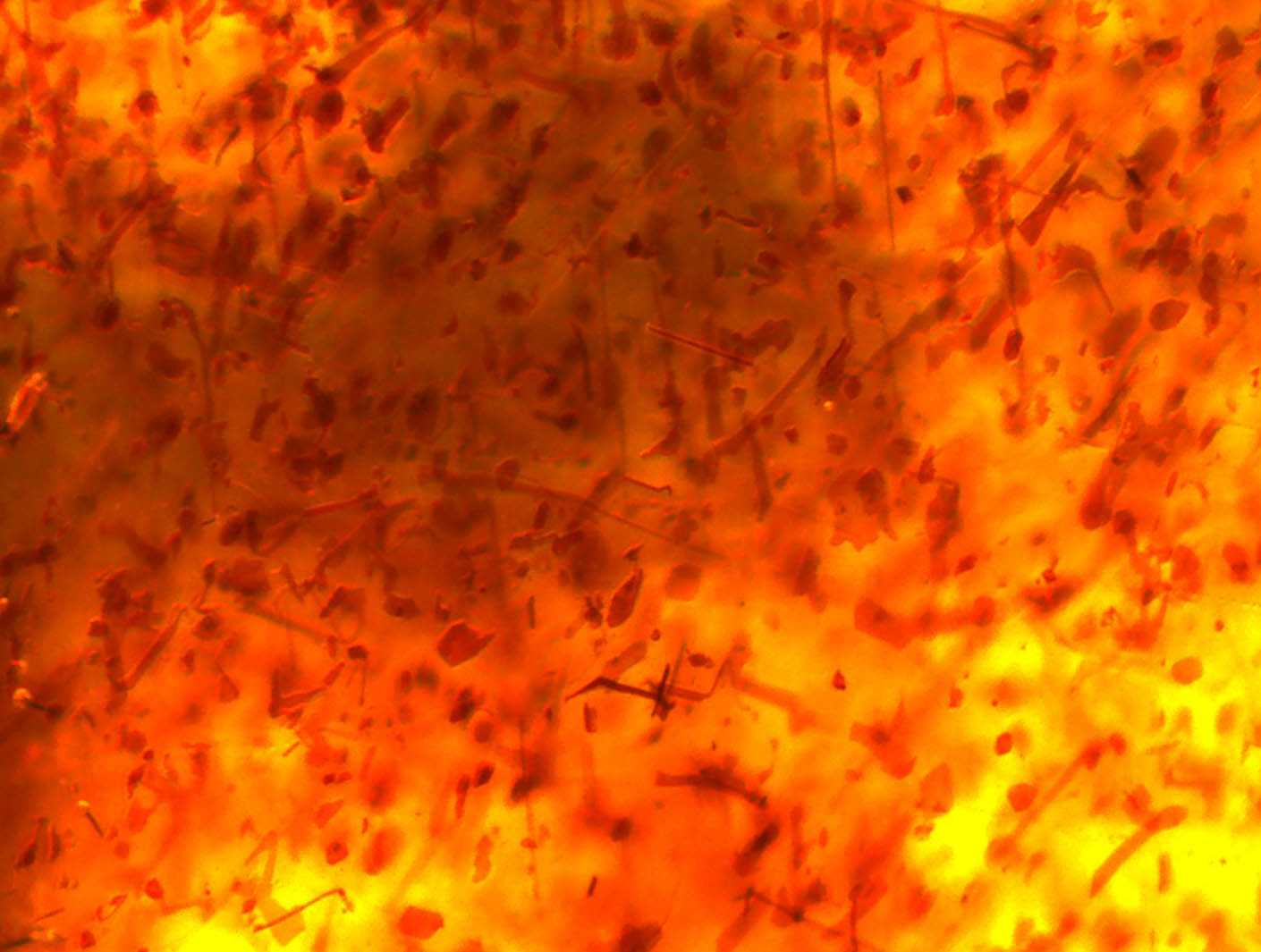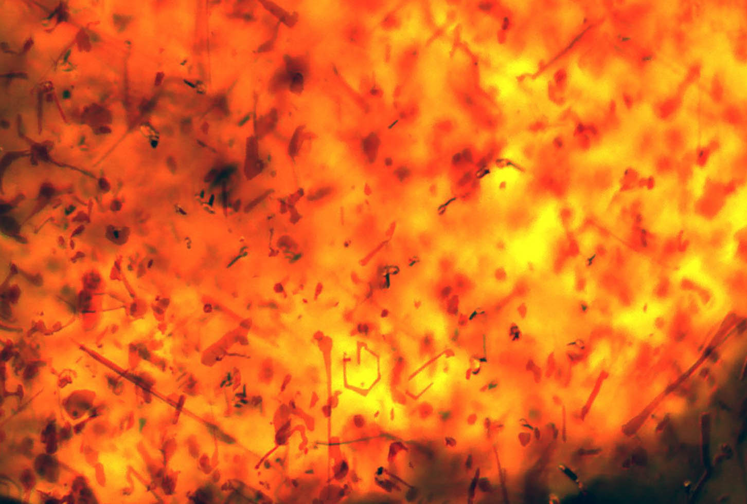 图3 粒状、针状、片状包体,还可见“六边形”的特殊图案