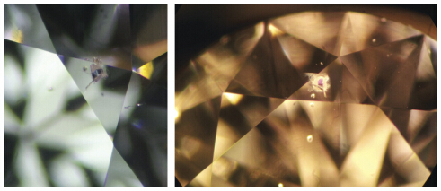 印度宝石学院的宝石鉴定实验室近期检测了一颗含有有趣内含物的钻石,0.30ct,无色,圆钻型。红外光谱显示了IaA型钻石的吸收峰,及由氢气中杂质引起的轻微的吸收峰。钻石的净度级别为SI2,含有几个无色晶体和一个破面灰绿色晶体(图1左)。白炽灯下,灰绿色的