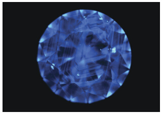 查尔斯滤色镜下呈鲜红色,指示铬元素的存在。在表面上有一个内含物晶体的抛光区域,但它太小,我们无法测试它的折射率。在正交偏光显微镜观察下,该内含物包体未显示多色性。浸液观察其为单折射。DV图案显示天然钻石生长面的荧光图案(图2)。蓝色N3荧光中的典型八面体生长区是显而易见的,与周围的颜色变化晶区无干扰。