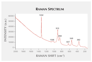 为给出内含物的鉴定结论,我们将钻石送至斋浦尔的宝石鉴定实验室,进行激光拉曼光谱仪测试。由于该变色晶体的断面在钻石表面,我们可以得到一个清晰的拉曼图谱(图3)。约1332cm-1为钻石吸收峰,1046、910、858、 637、549和362cm-1为石榴石吸收峰。910cm-1为铝榴石类质同象系列吸收峰,包括镁铝榴石、铁铝榴石、锰铝榴石。因此,内含物被鉴定为铝质石榴石。