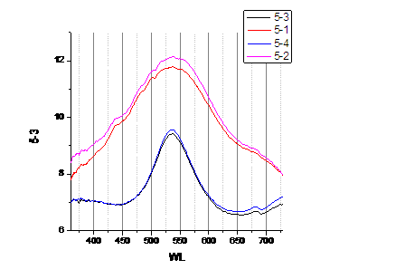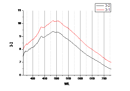 图4中,上两条谱线为浅色处,峰形明显区别于图2,446、490nm处吸收减弱,506nm处出现较明显吸收,可能为Ni的吸收;下两条谱线,吸收增强,693nm处吸收归因于Cr。