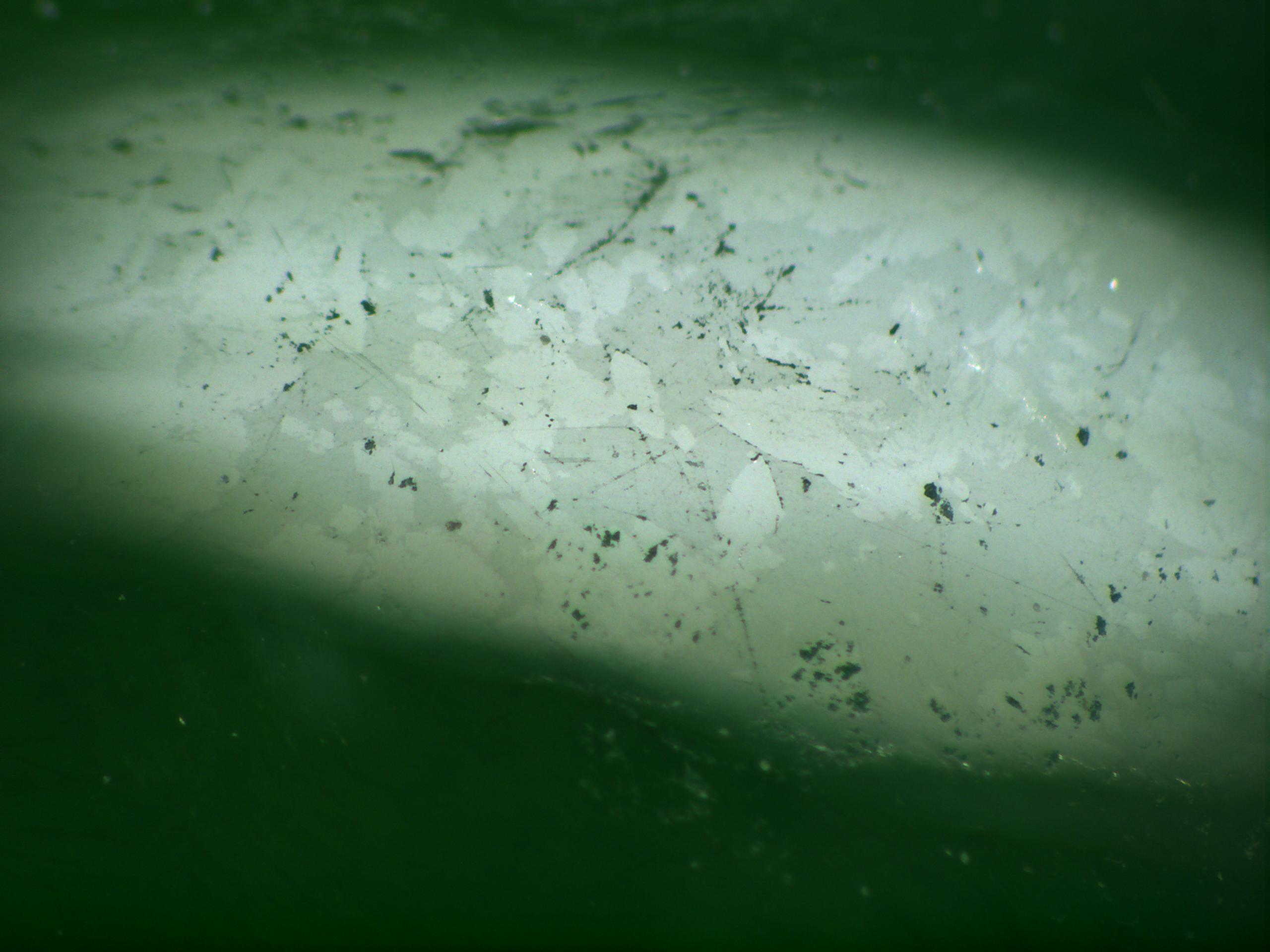综上,认为该件样品中主要矿物组成除了硬玉外,还有另外一种,从折射率判断推测为闪石族矿物,但需进一步确认。至于样品能否定名为“翡翠”是一个值得推敲的问题,所以说,珠宝检测需要认真,再认真!