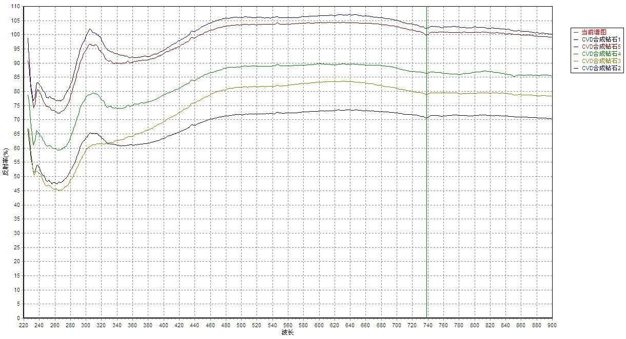1 实验样品 对5粒CVD合成钻石进行了常规宝石学基本特征、光谱学特征和发光图像特征等详细测试。 2 基本特征 5粒CVD合成钻石(样品1至样品5)均为标准圆钻型,重量为0.30~0.33ct;颜色近于无色,颜色级别为I~K;净度级别为VS1~SI2;在显微镜下观察,样品内部