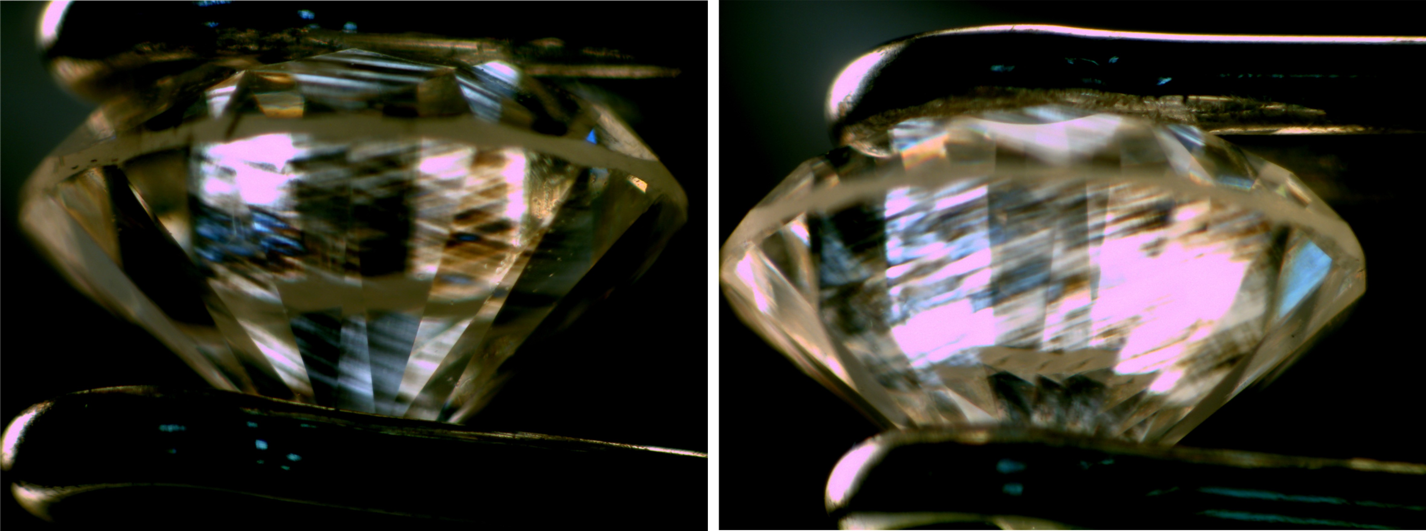 5粒样品具有相似的异常消光特征,从腰部观察,表现为“菱形”格子状的消光现象非常普遍(图9,左),当沿着腰的方向转动样品,在某些方向上,异常消光可变成“百页窗”式(图9右)。转动一周,异常消光以这两种特征为主,交替变换。
