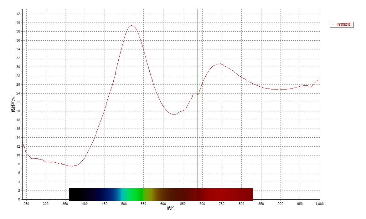 采用GEM-3000紫外-可见光-近红外光谱仪对样品进行测试,绿色部分可见685nm左右强吸收峰,620、650nm左右吸收带;褐色部分可见520nm左右宽吸收带。