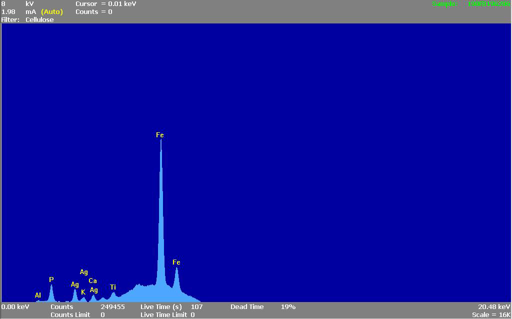 采用X射线荧光光谱仪分析样品的微量元素,主要元素为Fe、P,K、Ca含量较低。(图6)