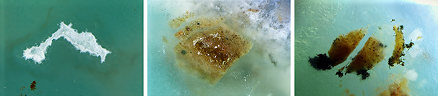 显微观察显示,由一些区域呈现细微的条带和在某些粗大的石英颗粒间出现微弱的绿色浓集而形成的一种规则的集合体构造,看起来好象一种的绿色矿物相沿石英颗粒分布。断口可见蜡状光泽,符合集合体特征。一些区域包含有小的充满晶簇状无色石英晶体的腔体(图3,左和中)。绝大多数检测样品中可观察到分散的多种暗褐色和黑色金属氧化物内含物,某些区域并伴有不明的白色云状内含物(图3,右)。