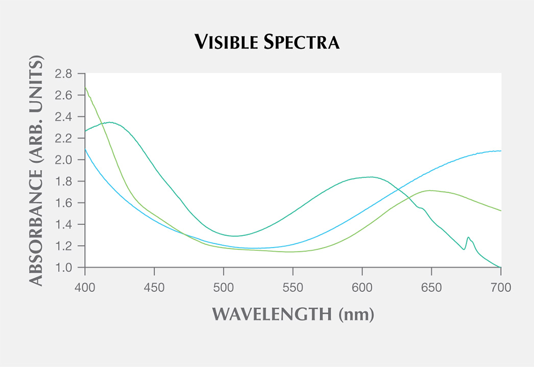 拉曼光谱分析证实这种材料为石英。用EDXRF分析致色的微量元素。经测试的七块宝石中都含有铬和镍。有趣的是在一件切好的样品中也测到了铁、钒和铜元素,但是这些元素与颜色成因无关,因为其他蓝绿色样品中不含这些元素。可见光吸收谱(图4)显示大致以420和600nm为中心的宽吸收带,并伴有大致以500nm为中心的弱吸收区是产生蓝绿色的原因。646、676、679nm尖锐吸收峰推测与铬有关。