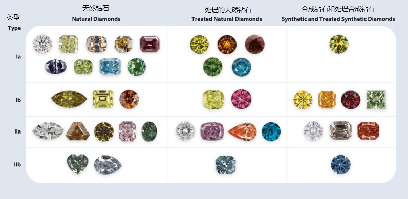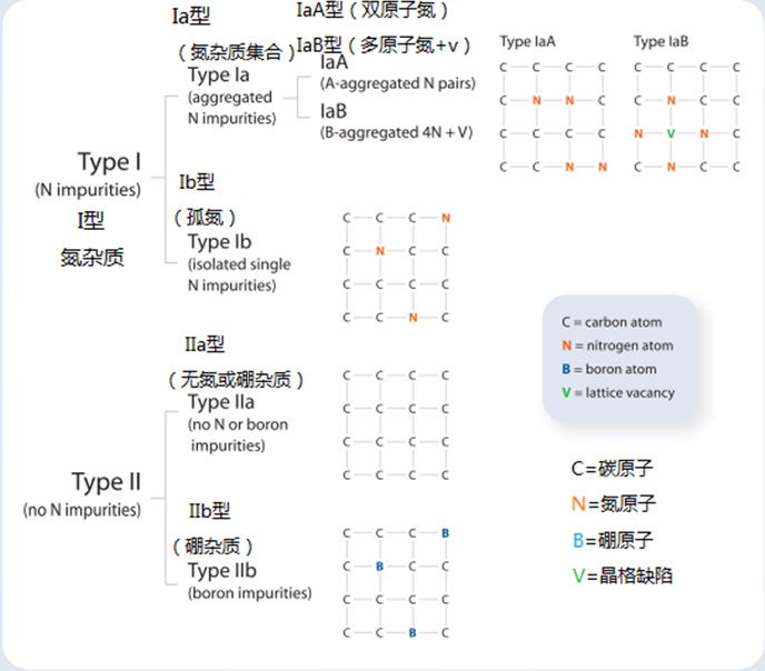 纯净的钻石是单一碳元素组成的。原子以宝石中很少见的规律重复的形式排列(钻石晶格)。但是氮原子和硼原子可以置换并替代晶格中的碳原子。虽然其它杂质元素也可以出现在钻石晶格中,但钻石类型划分系统仅仅依据钻石中是否含有氮原子和硼原子,以及他们如何在晶格中排列(图2)。