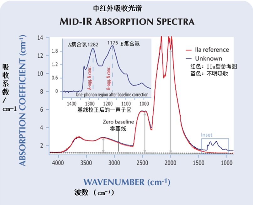 完成如上图的N原子集合过程的某些天然钻石 (Collins et al., 2005),成为了几乎“纯粹”的IaB型钻石,但是许多情况下,氮杂质的不同形态会同时存在于一个单晶中,因为还有一些未完成的集合 (Hainschwang et al.,2006)。另一个导致混合型光谱存在的原因是,大多数I型钻石的同一单晶中,存在氮结构或氮数量不同的区域(e.g., Breeding, 2005; Chadwick, 2008)。这种情况,加上刻面钻石测试红外光谱的方式,使得避开混合型光谱几乎不可能。测试光谱时,仪器需要对准钻石的方向,使红外光束径直通过钻石到达另一端的探测器。但光线会在刻面钻石内不断反射而不会直接通过,使红外光谱难以得到。