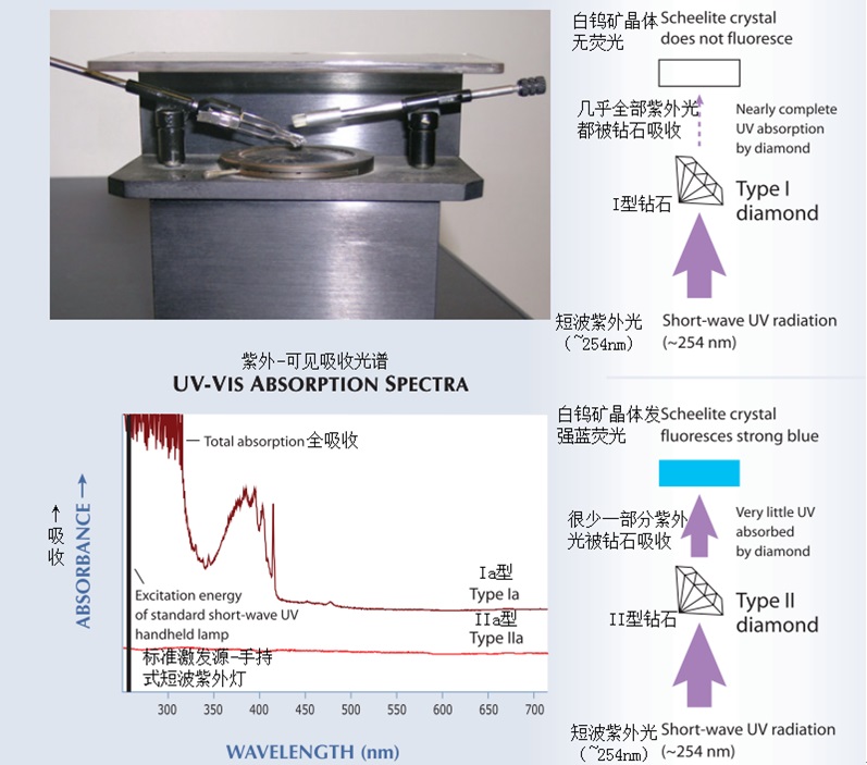 短波紫外透过率:商用/通俗测试。早先提到,最初就是使用短波紫外透过率来区分I型和II型钻石,这个构造简单的宝石仪器由短波(~254nm)紫外灯组成,开口朝上发射紫外光,然后将钻石放在上面(图10)。对短波紫外光有强烈荧光反应的材料,比如白钨矿,放在钻石上面。如果钻石传导紫外光,白钨矿就会发荧光。如果钻石吸收了短波紫外光,白钨矿就不会发光。这种简答的测试方法可以非常有效的区分I型和II型钻石,因为氮杂质会强烈的吸收~225-320nm范围的紫外光(如图10)。非常少见的纯Ib型钻石有时也会传导短波紫外光 (Chalain,2003)。商用的基于紫外透过率的钻石筛选仪也可用于这种测试(Chalain et al., 2000)。