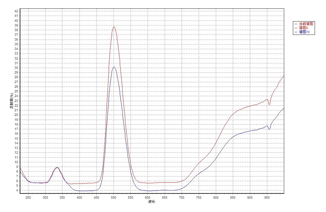在GEM-3000珠宝检测仪下,从不同方向对样品进行检测,得到紫外-可见吸收光谱(图7)。样品在400~470nm之间、550~700nm之间分别有两个宽吸收带。