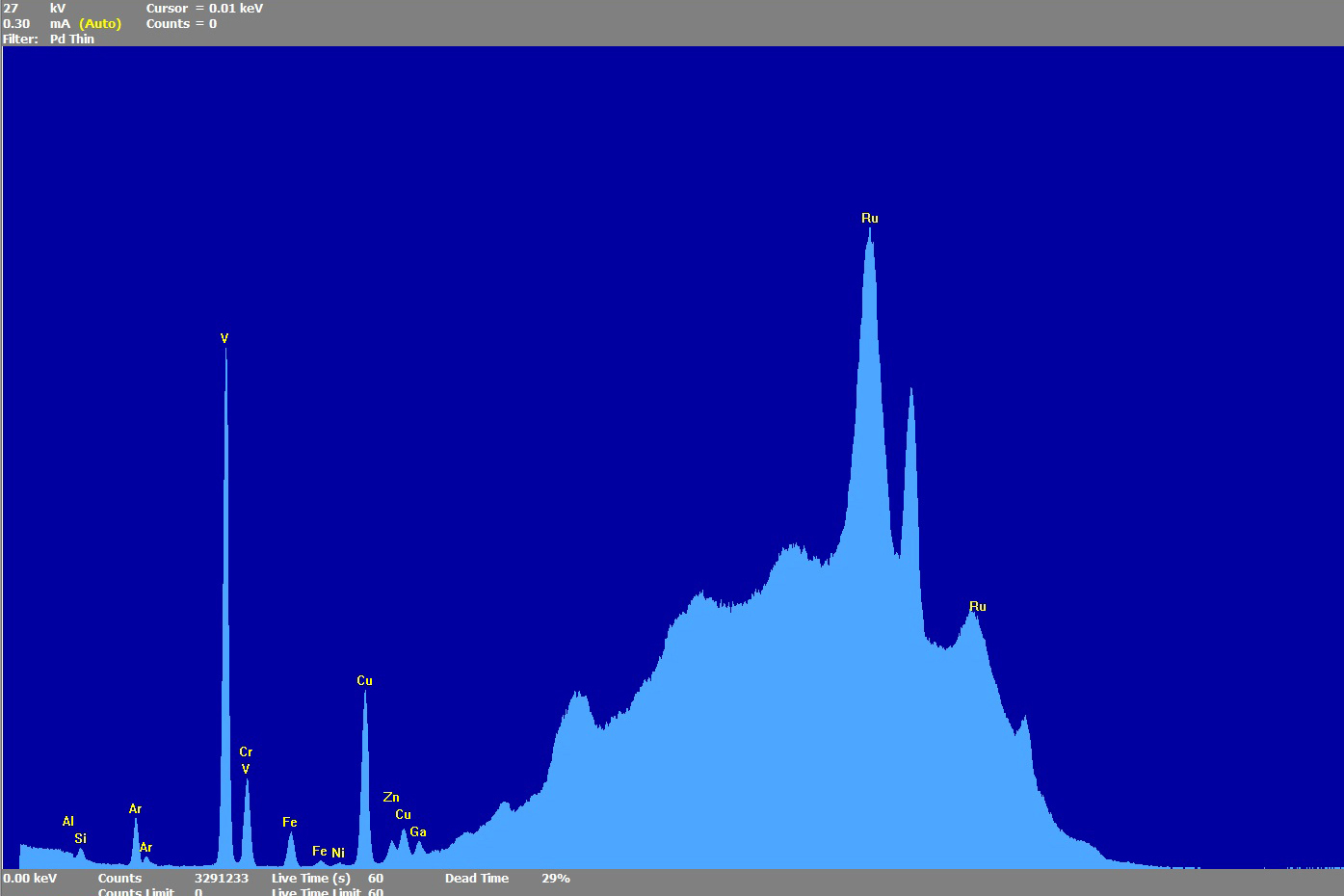 利用X射线荧光光谱仪,在27KV条件下对样品进行元素分析,可以得出样品主要含V、Fe、Cu元素。(图8)