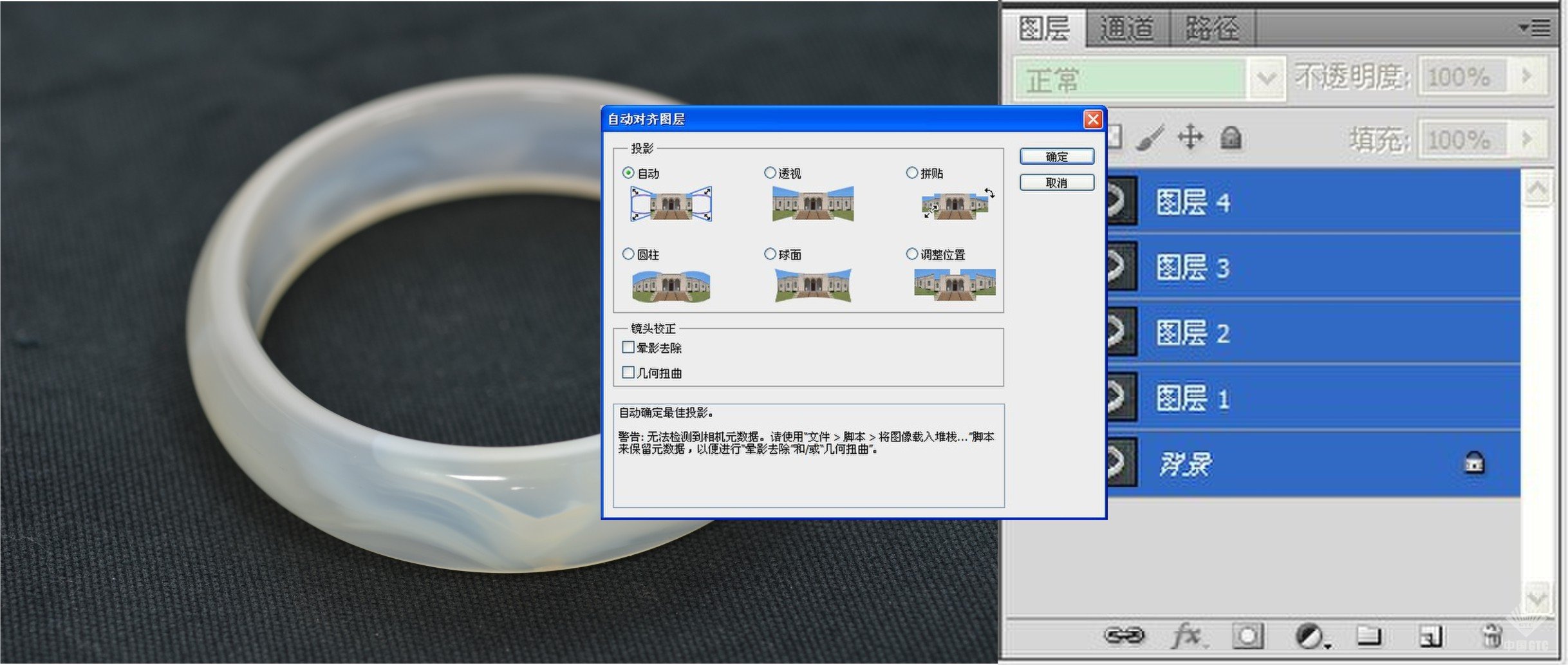 用Ctrl键同时将所有图层全部激活成蓝色,执行【编辑】|【自动对齐图层】命令。这步操作的目的是将所有图层都对齐,以方便后面的混合操作。