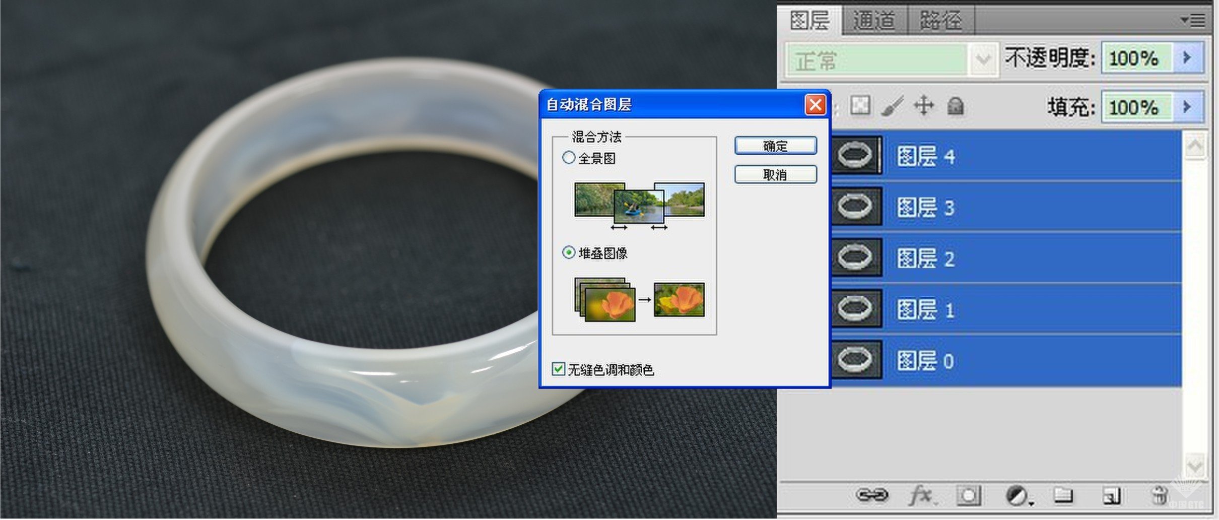 接下来,还是在选中全部图层的基础上执行【编辑】|【自动混合图层】命令,并在混合方法中选择“堆叠图像”。